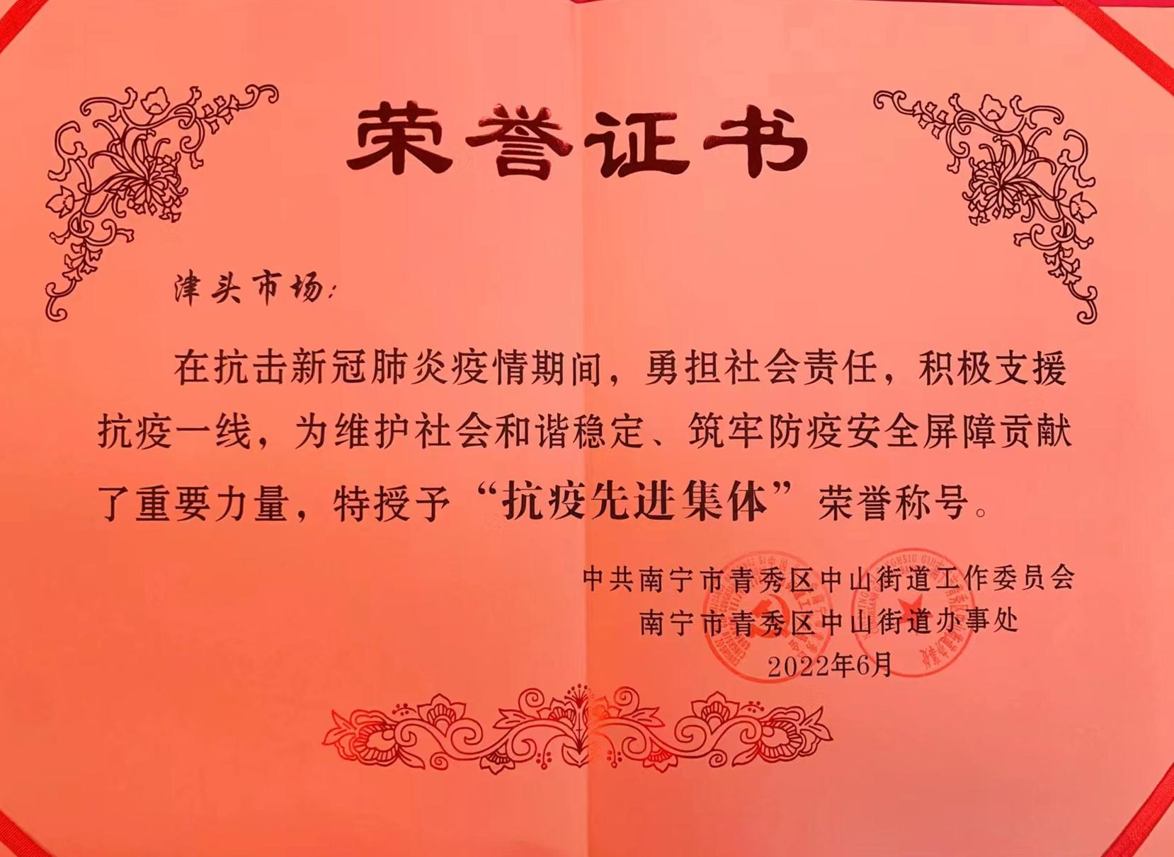 近日,為表彰在抗擊新冠肺炎疫情中的突出貢獻(xiàn),南寧市青秀區(qū)中山街道辦授予威寧市場(chǎng)公司經(jīng)營管理的津頭市場(chǎng)“抗疫先進(jìn)集體”稱號(hào)。