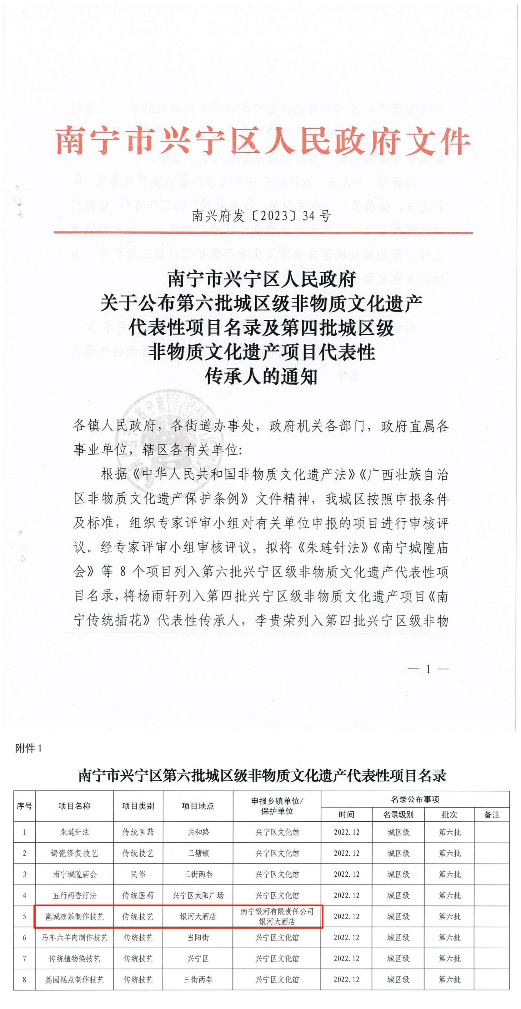 近日,南寧市興寧區(qū)人民政府公布《第六批城區(qū)級(jí)非物質(zhì)文化遺產(chǎn)代表性項(xiàng)目名錄及第四批城區(qū)級(jí)非物質(zhì)文化遺產(chǎn)項(xiàng)目代表性傳承人的通知》文件,南寧銀河大酒店“邕城涼茶制作技藝”成功入選第六批興寧區(qū)非物質(zhì)文化遺產(chǎn)代表性項(xiàng)目名錄,這也代表著邕城涼茶文化邁向新的發(fā)展臺(tái)階。
