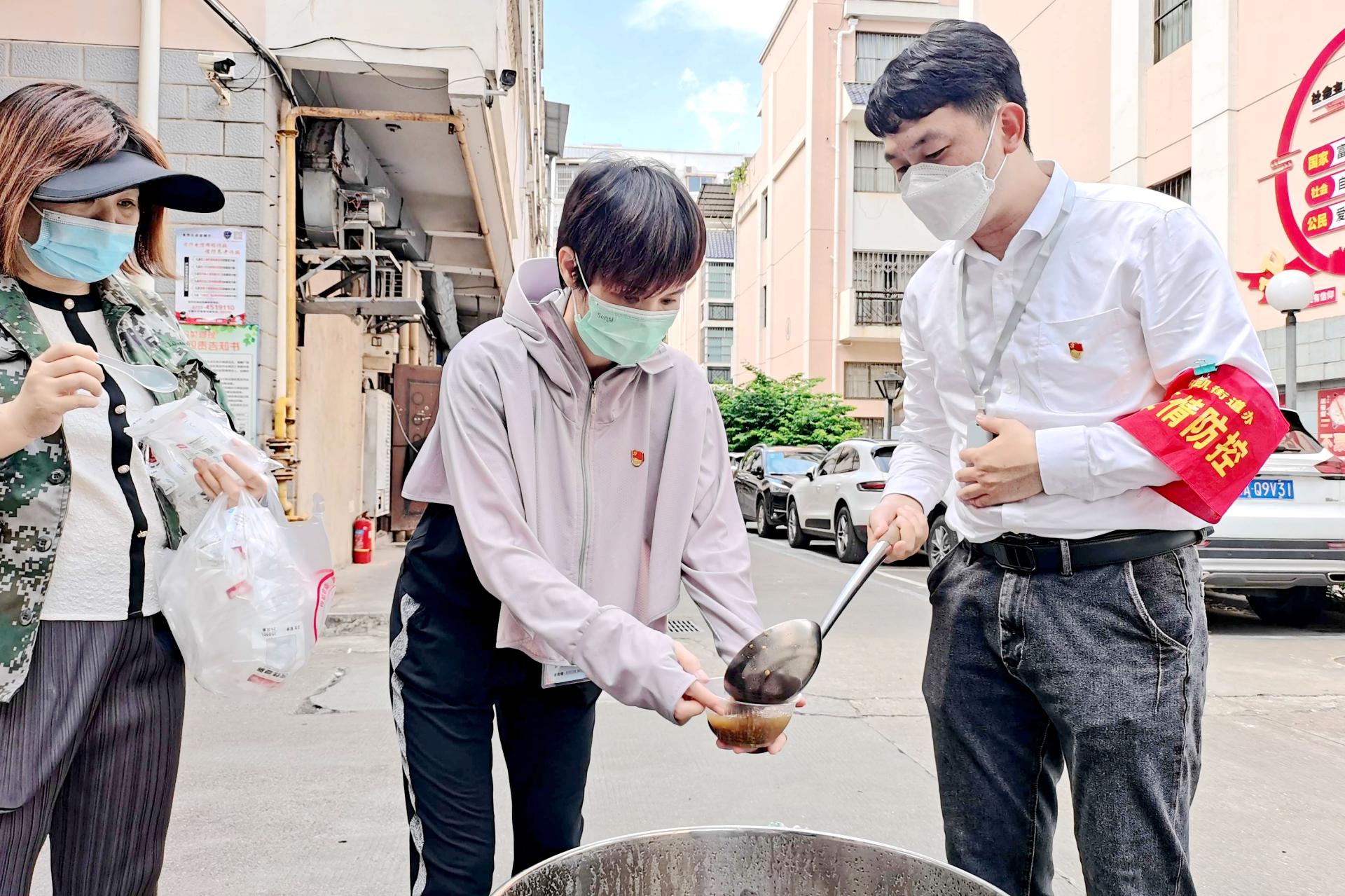 威耀供應(yīng)鏈公司、威凱智慧物業(yè)公司、融達(dá)小貸公司贈送綠豆沙飲品為社區(qū)工作人員解暑
