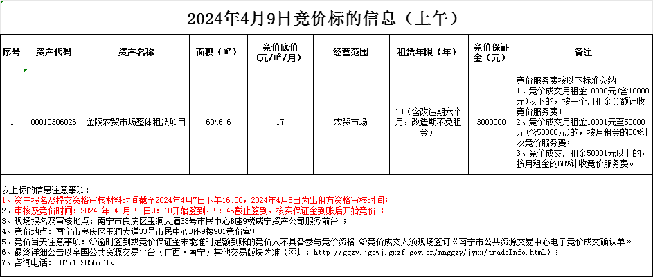 2024年4月9日競價標(biāo)的信息(線下報價)