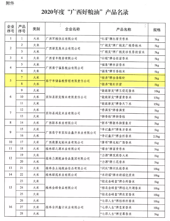 近日,2020年度“廣西好糧油”產(chǎn)品名錄正式公布,集團(tuán)下屬的威寧市場公司監(jiān)管單位儲備糧公司旗下“桂井”牌金泰銀針和銀針絲苗2個大米產(chǎn)品榜上有名。