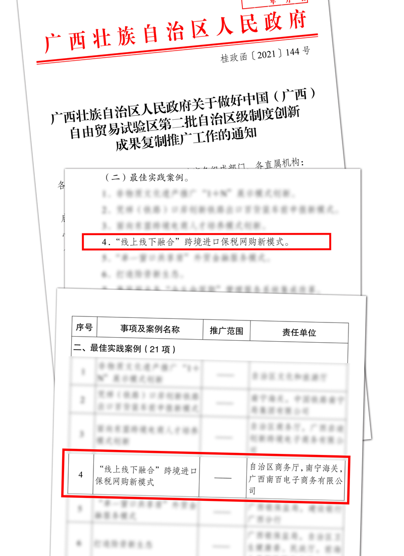 近期,南百保稅倉項目在“廣西自貿(mào)區(qū)制度創(chuàng)新成果”中入選最佳案例,并獲在全區(qū)復(fù)制推廣。南寧百貨緊跟《中國(南寧)跨境電子商務(wù)綜合試驗區(qū)發(fā)展規(guī)劃(2021-2025)》要求,持續(xù)推動跨境電商線上線下業(yè)務(wù)發(fā)展,通過模式、人才、營銷等工作三管齊下,積極主動探索業(yè)務(wù)新融合新動能,做好南百保稅倉運(yùn)營。