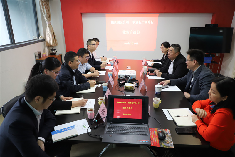 2022年3月10日上午,農(nóng)發(fā)行廣西區(qū)分行糧棉油與產(chǎn)業(yè)客戶處處長(zhǎng)韋敏率隊(duì)到糧食園區(qū)公司洽談園區(qū)項(xiàng)目物流中心工程建設(shè)融資合作事宜