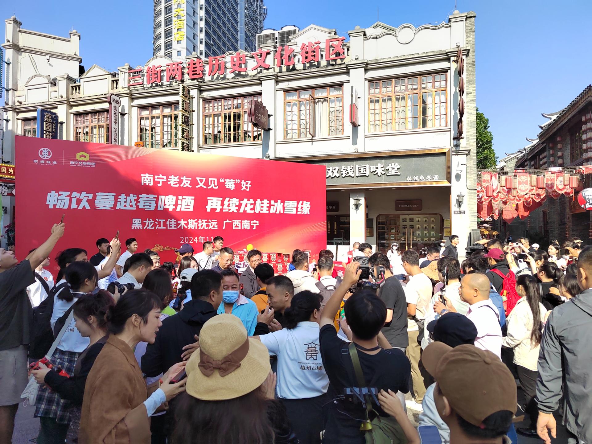 2024年年初,跨越南北3650公里來到南寧的東北蔓越莓在邕州古城·三街兩巷發(fā)放,南寧市民領(lǐng)取蔓越莓的熱鬧場景依舊歷歷在目。如今蔓越莓再豐收,熱情的東北“老鐵”將蔓越莓“變身”釀成啤酒贈予南寧“老友”品嘗。11月10日,南寧威寧集團下屬南寧文化旅游集團有限責(zé)任公司(以下簡稱南寧文旅集團)的兩大標(biāo)志性項目——邕州古城·三街兩巷與廣西體育中心,成為了蔓越莓啤酒的發(fā)放站點,而銀河大酒店、鄉(xiāng)村大世界、五象山莊、邕城...